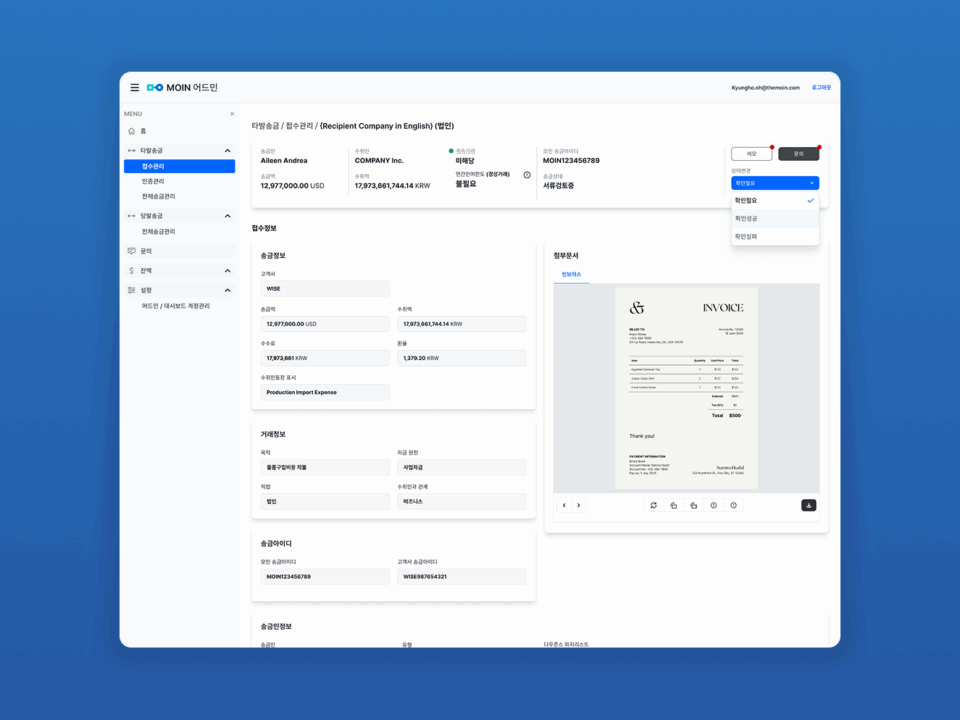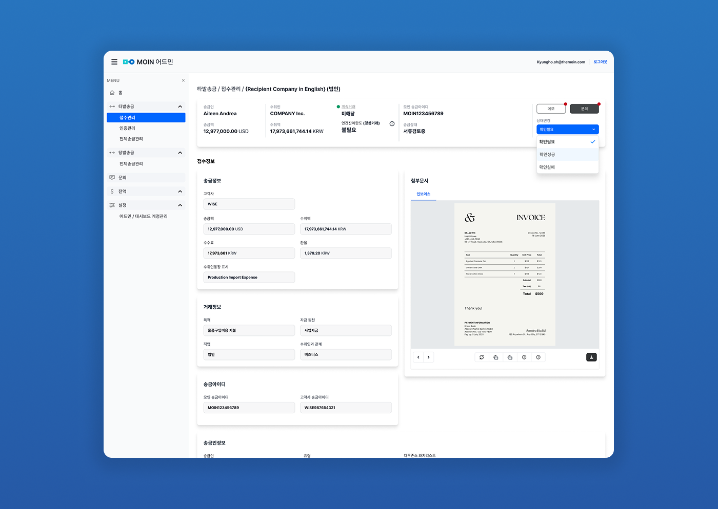 - 해외 송금 · 지급결제 서비스 플랫폼 제품을 기획하고 디자인하였습니다. 개인 또는 기업이 국경을 넘는 거래를 안전하고 효율적으로 수행할 수 있도록 지원하는 디지털 기반의 금융 서비스 인프라로 해당 시스템은 거래 요청, 수취, 실명 인증, 거래 상태 추적, 파트너 연계, 정산 및 보고 기능을 통합적으로 제공하는 종단 간(End-to-End) 송금 · 지급결제 거래 관리 플랫폼입니다. 영국 소재 글로벌 핀테크 기업 W사의 타발송금 거래를 해당 플랫폼을 통해 운영 예정입니다.